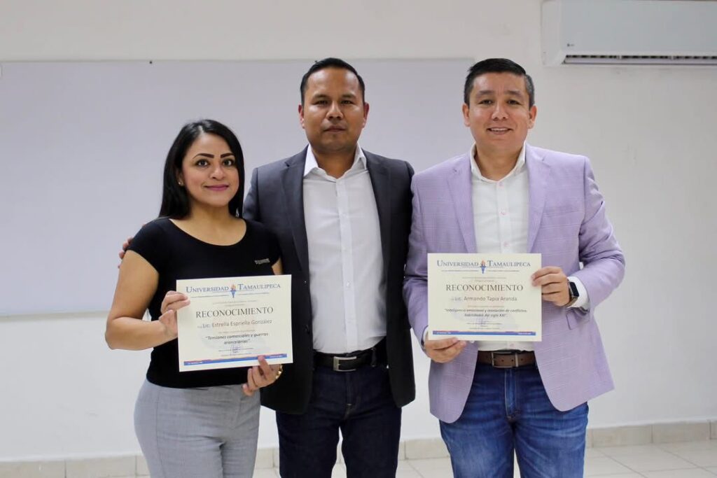 En el auditorio de la Universidad Tamaulipeca se realizaron dos conferencias para estudiantes: el Psicólogo Armando Tapia Aranda impartió “Inteligencia emocional y resolución de conflictos” para la Facultad de Ciencias de la Conducta y la Educación, como parte del cierre de la materia Técnicas de negociación y manejo de conflictos.